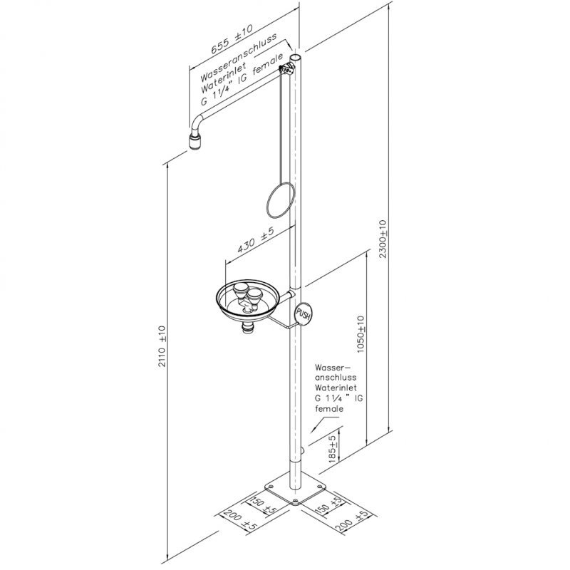 Volně stojící nouzová tělní sprcha s kompaktní oční sprchou s miskou - detaily