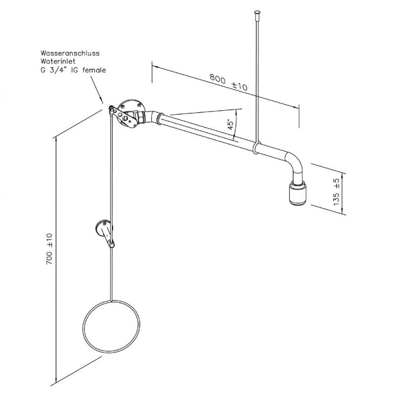 Tělní nouzová sprcha s táhlem, nad dveře pod úhlem 45°, na omítku - detaily