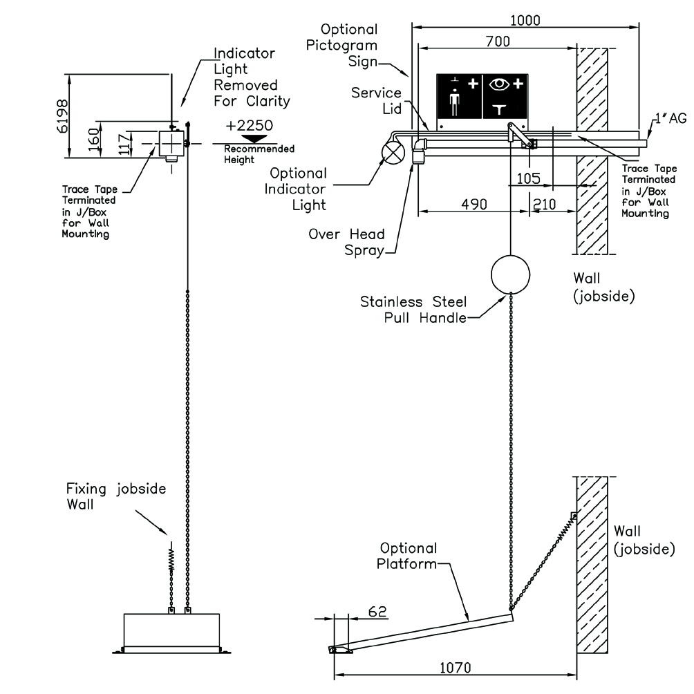 Mrazuvzdorná nerezová tělní nouzová sprcha s vyhříváním, pod omítku - detaily