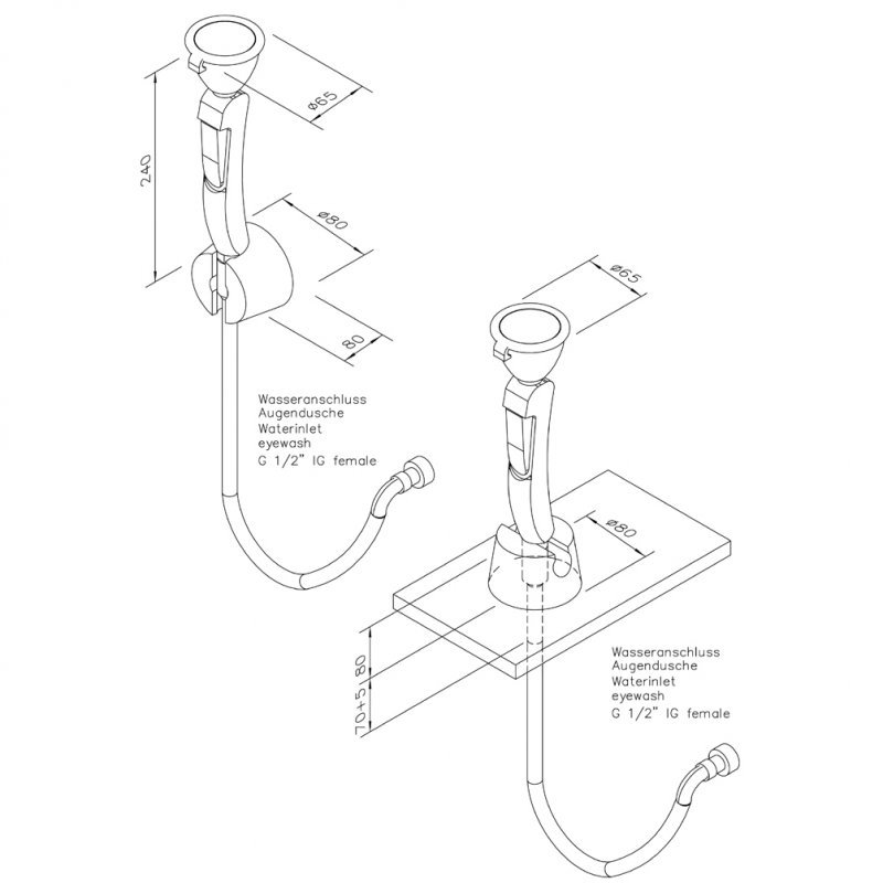 Ruční nouzová sprcha s jednou hlavicí, proud svisle vzhůru - detaily